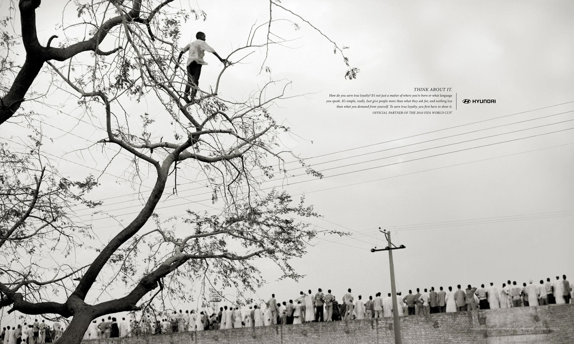 COPY: Think about it. How do you earn true loyalty? It’s not just a matter of where you’re born or what language you speak. It’s simple, really. Just give people more than what they ask for, and nothing less than what you demand from yourself. To earn true loyalty, you first have to show it. Hyundai. Official partner of the 2010 FIFA World Cup.