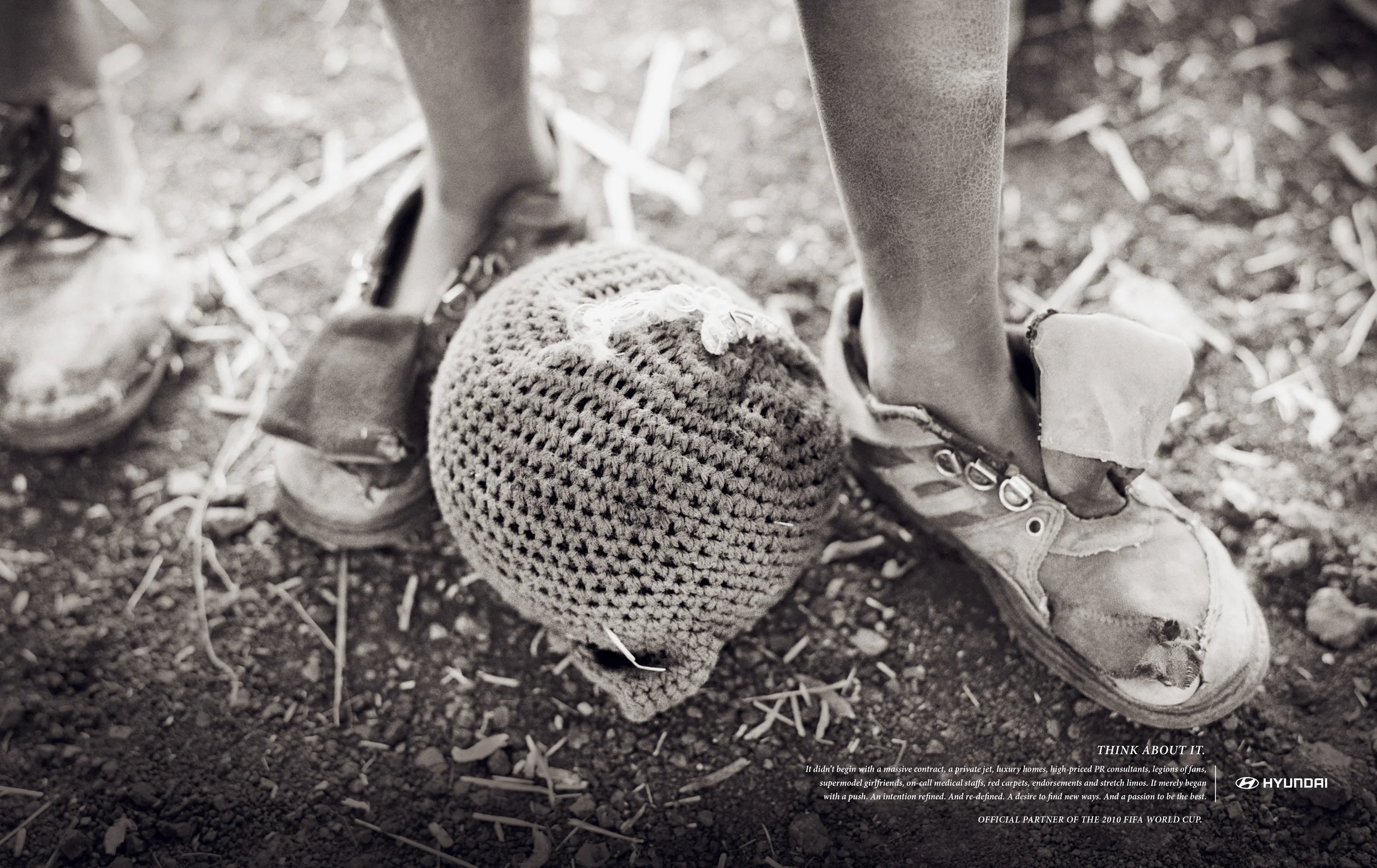 COPY: Think about it. It didn’t begin with a massive contract, a private jet, luxury homes, high-priced PR consultants, legions of fans, supermodel girlfriends, on-call medical staffs, red carpets, endorsements and stretch limos. It merely began with a push. An intention refined. And re-defined. A desire to find new ways. And a passion to be the best. Hyundai. Official partner of the 2010 FIFA World Cup.