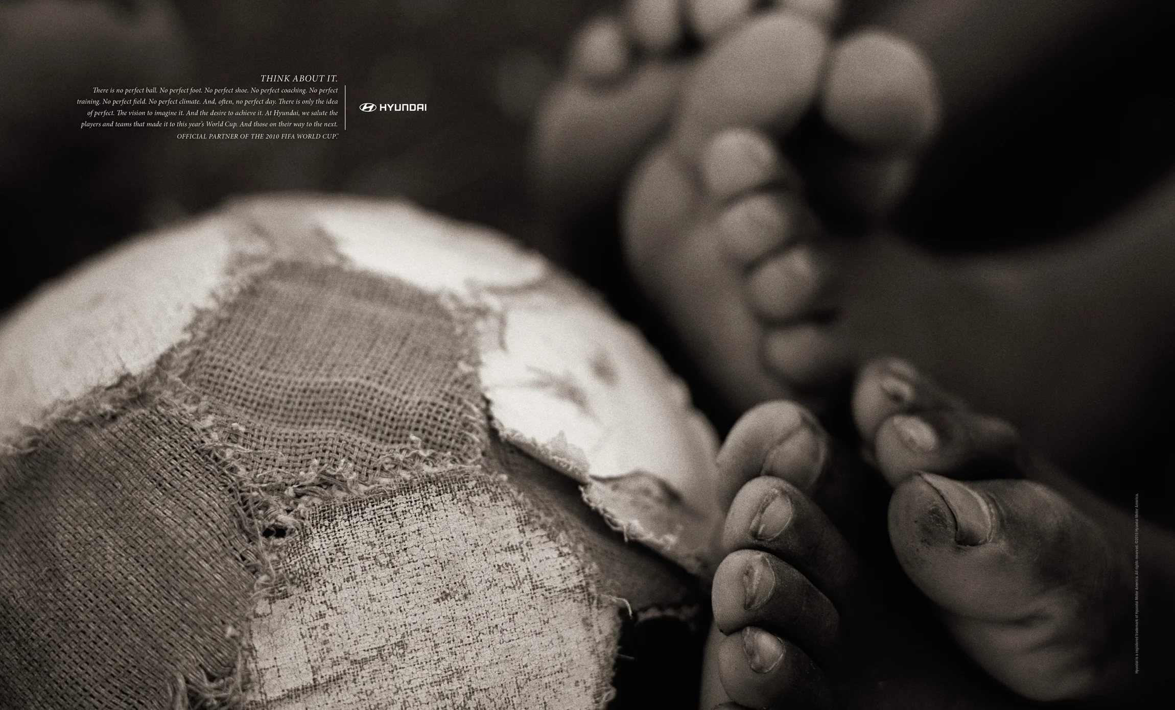 COPY: Think about it. There is no perfect ball. No perfect foot. No perfect shoe. No perfect coaching. No perfect training. No perfect field. No perfect climate. And, often, no perfect day. There is only the idea of perfect. The vision to imagine it. And the desire to achieve it. At Hyundai, we salute the players and teams that made it to this year’s World Cup. And those on their way to the next. Hyundai. Official partner of the 2010 FIFA World Cup.