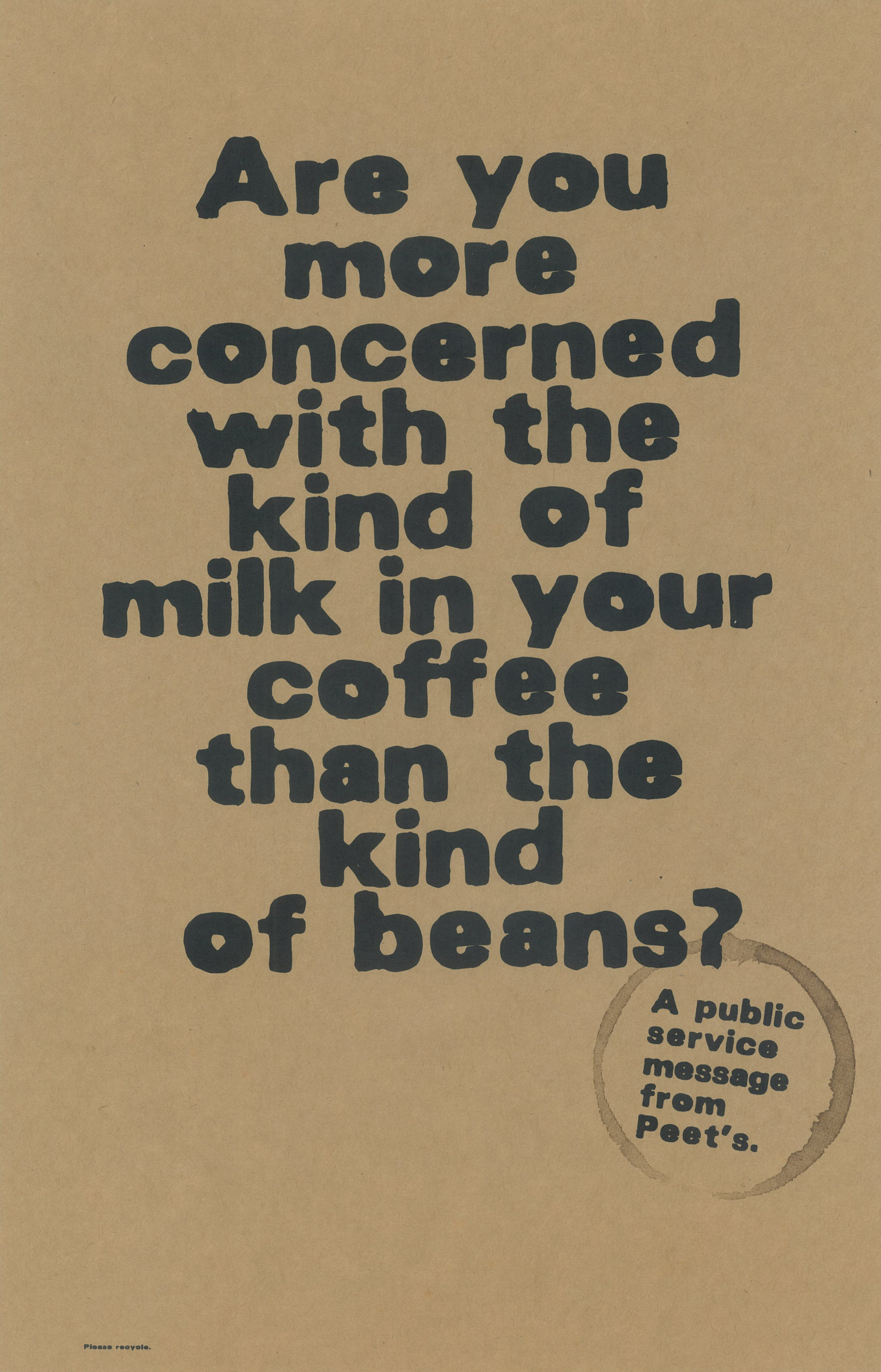 Jerry Baldwin learned how to roast coffee from Alfred Peet. So Jerry knew that "no matter how good we would make Starbucks, it would never be Peet’s." Because Peet's isn't just about a consistent cup of coffee. It's about the best cup of coffee. Our poster/print campaign for Peet’s introduced the country to the brand's hardcore philosophy.